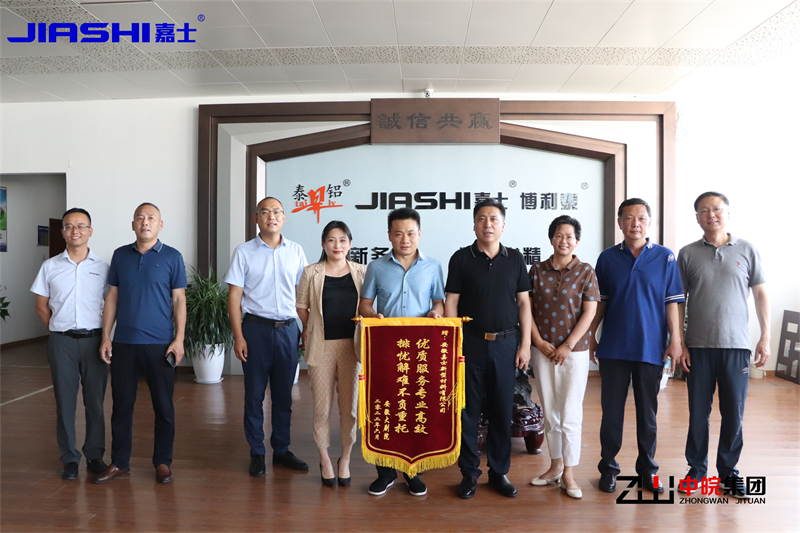 图为安徽大剧院季总、张总等领导赠予头号玩家官网登录入口集团-嘉士铝单板的锦旗。